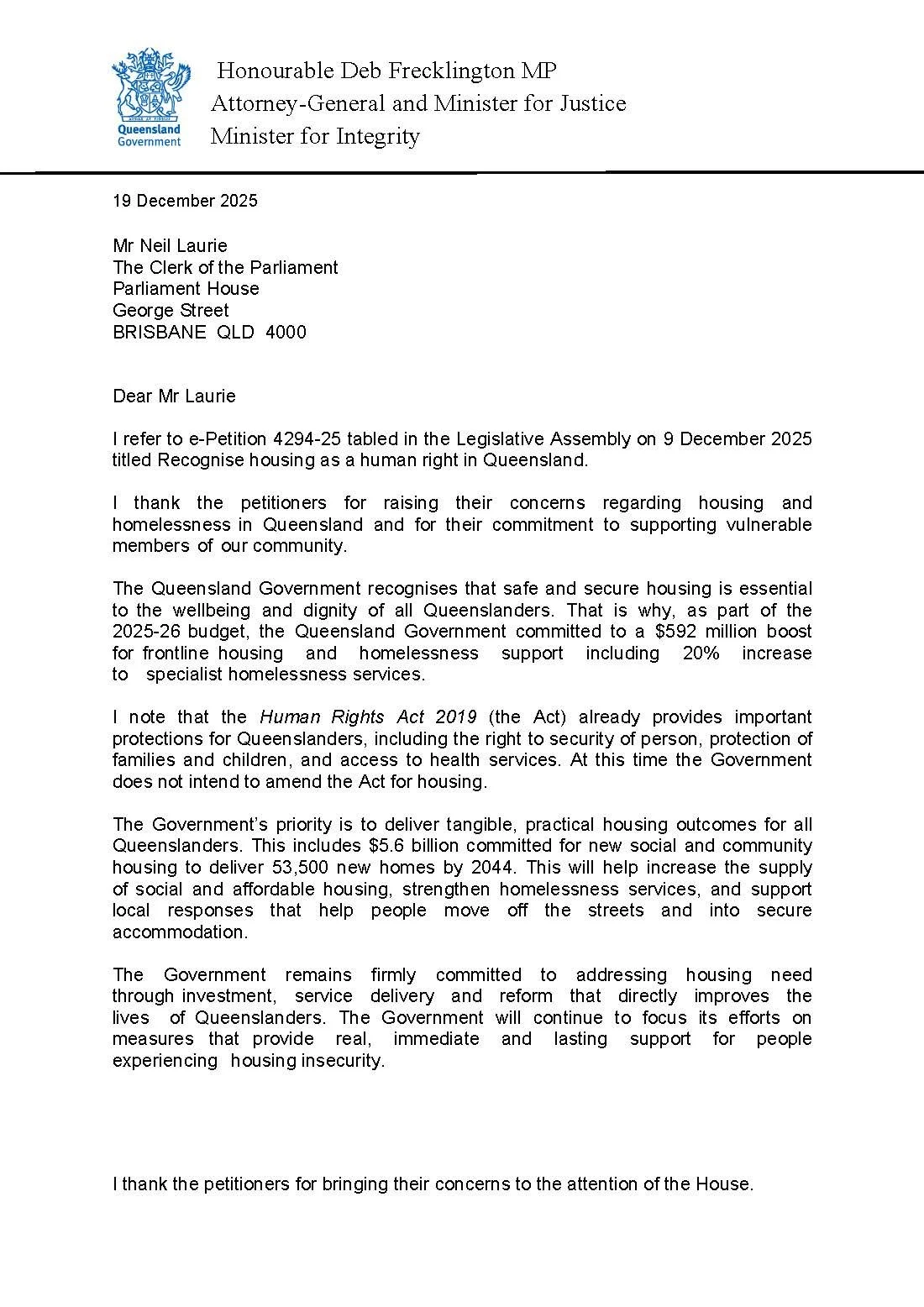In December 2025 we received a response from the Queensland Government to our petition to have housing added into the Human Rights Act 2019. See the Minister’s response.